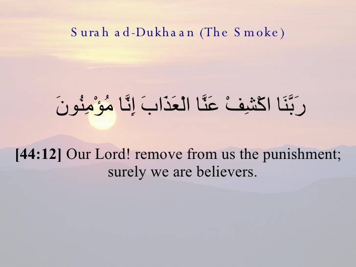KETIGA, ada doa bagus yang diajarkan Allah dalam Surat AD-Dukhon ini. Doa tersebut diletakkan pas setelah pernyataan bahwa asap itu adalah bagian dari azab Allah SWT.